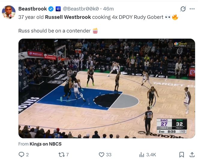 下半场7中0背锅?威少8+10+7吞三连败 美记:本有机会染指最佳PG